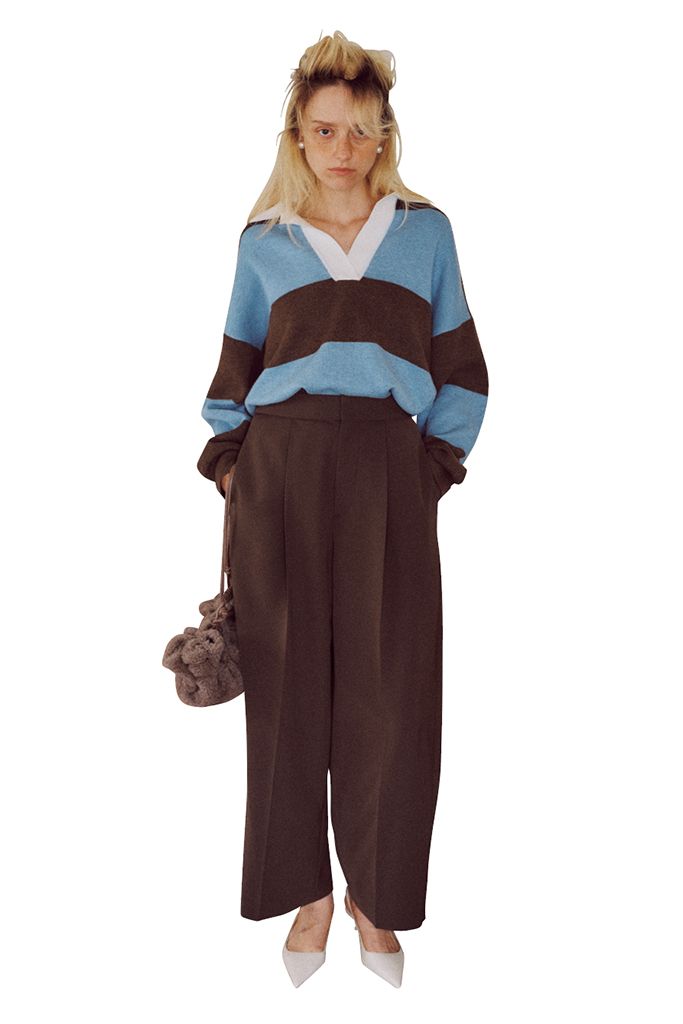 ボーダーラガーニット/ジジ ストゥディオ(ユナイテッドアローズ グリーンレーベル リラクシング 自由が丘店) ブラウンパンツ/アストラット(アストラット 新宿店) イヤリング/アビステ バッグ/HEREU(ヘリュージャパン オフィシャルオンラインストア) パンプス/MANGO