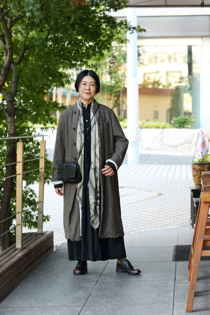 普段はオフィス内でデザイン画を描くことが多い須田さん。展示会に出かけるときは、大判のストールをインにして、エコウールのヘリンボーン柄コートをはおります。「このコートはパドカレの今シーズンのイチ推しで、スローライフを提案しています」(須田さん)。インに着た黒のワンピースとグレーのコートをつなぐのは、ボタニカルプリントのストール。重く見えがちなコートスタイルを軽やかに。袖口を折り返して白い裏地を見せると、こなれて見えます。