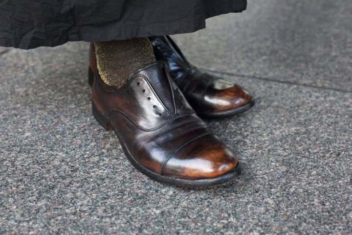 ブラウンのレザーにブラックで「汚し」をかけたスリッポンは、存在感が抜群。「黒が多めなので、茶色を差し色にします」と須田さん。マニッシュなコートスタイルを引き立てます。