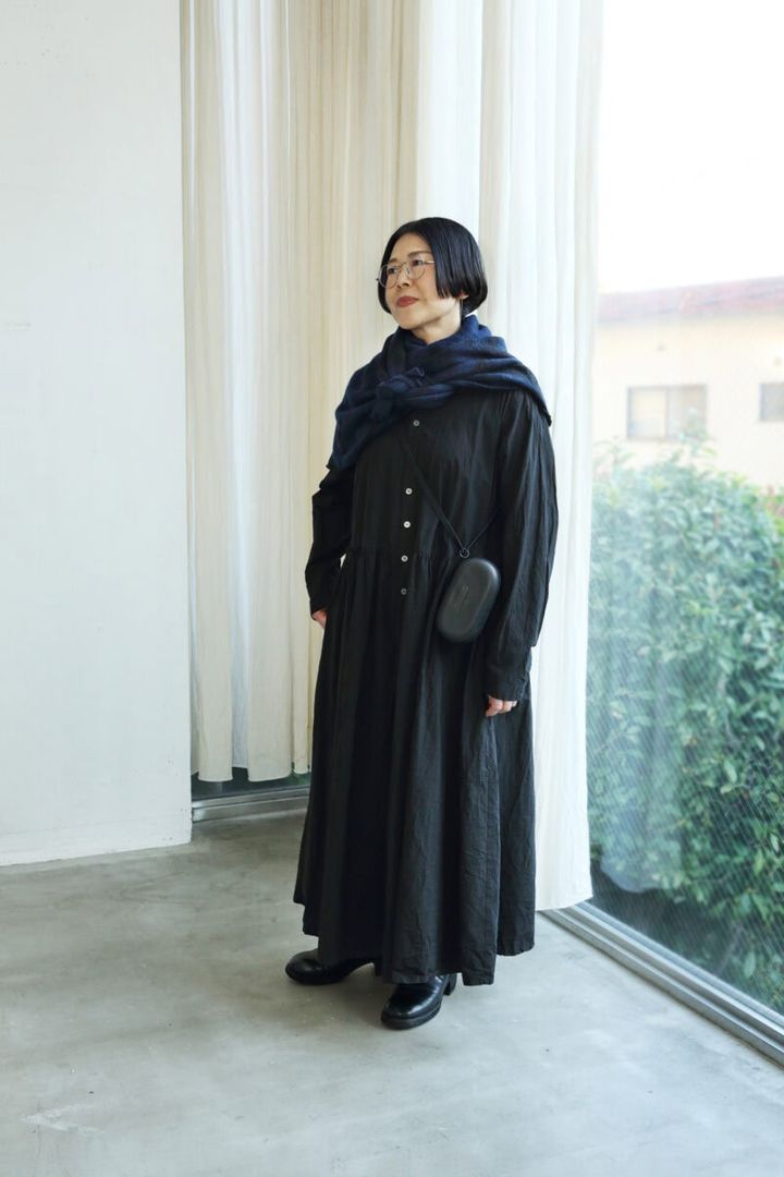 コットン100%のシワ加工のワンピースは、パドカレの定番。「ウエストをリボンで絞ったり、ボタンを開けたりと、いろんな着こなしができます」と須田さん。カシミアセーターをストールのように巻きました。「オフィスワークの日は、首に肌ざわりのいいセーターをストールのように巻くと、便利。全身が真っ黒にならないように、有松絞り模様のネイビーカラーを差し色にしました」(須田さん)。