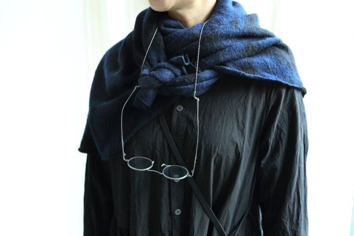 オールブラックのコーデに、黒×ネイビーの有松絞りのカシミアセーターをふわりと巻いて、温かみをプラス。チェーン付きのメガネをネックレスのように垂らすとモードな印象になります。