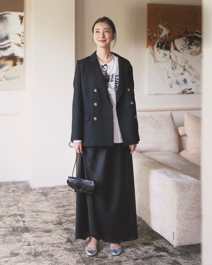 11月12日(水)、きれいめ派でもグラフィックTシャツを取り入れたい。それならモノトーンのアイテムを選ぶのが正解です。ゴールドボタンのジャケットを羽織れば、Tシャツのカジュアルさが程よく中和されて、上品なムードに。黒のサテンスカートで大人っぽい艶感を足して、抜けのある“ハンサムフェミニン”が完成します。足元はぺたんこ靴やローヒールで、気負わないこなれ感をプラスして。