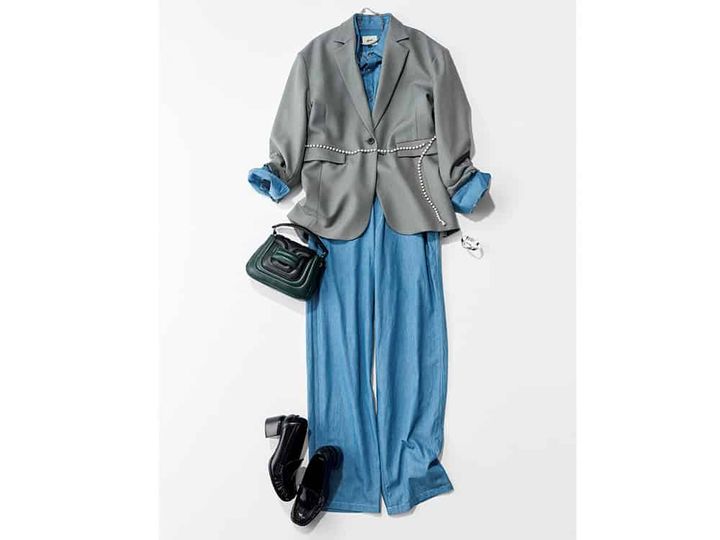 ジャケット〈パールベルト付き〉¥33,000(マノフ/クラネ デザイン)シャツ¥36,300パンツ¥30,800(ともにベイザー/THIRD MAGAZINE)バッグ¥178,200シューズ¥189,200(ともにピエール アルディ/ピエール アルディ 東京)ネックレス¥82,500(ウノアエレシルバーコレクション/ウノアエレ ジャパン)バングル¥7,830(アビステ)