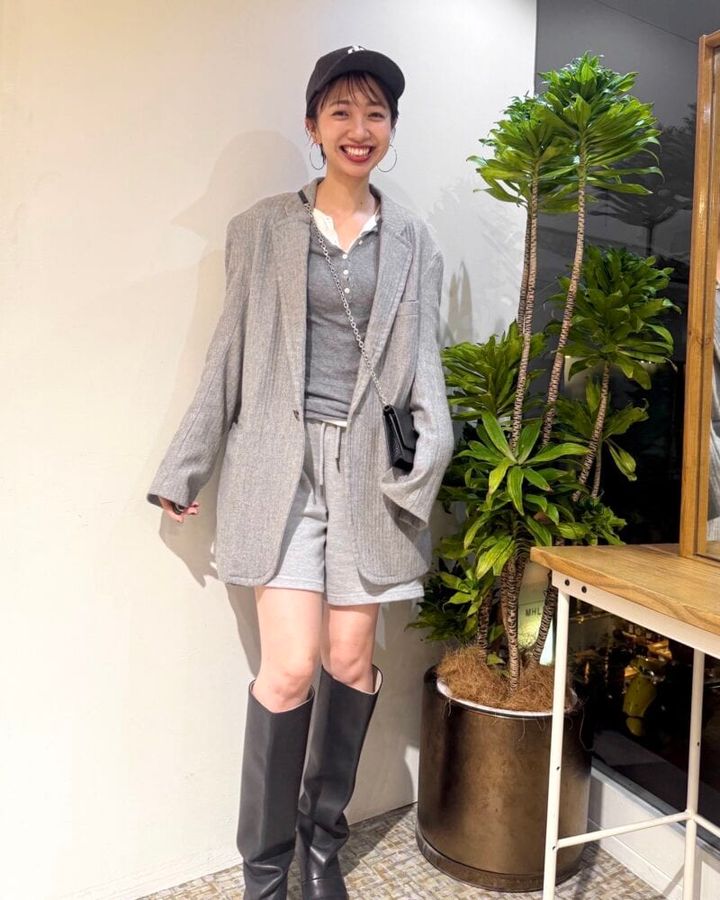 キャップやスウェットショーパンを使った、スポーツテイストを感じる着こなし。カジュアルになりすぎないように、濃淡の違うグレーで統一することで、スタイリッシュに昇華しています。ジャケットとショートパンツ、ロングブーツで丈バランスや肌見せ具合を調整しているのも、大人の余裕を感じます。