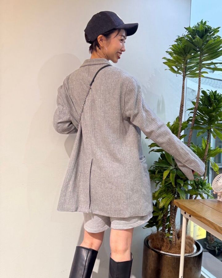 「グレーのワントーンコーデを意識して、大人可愛くまとめました! トレンドのビッグジャケットを使い、ショートパンツ&ブーツに合わせて、ちょっぴりスタイルアップも狙っています。後ろから見ると、ビッグジャケットからちらっと見えるパンツも可愛いんです♡」(美容師 丸岡奈央さん)