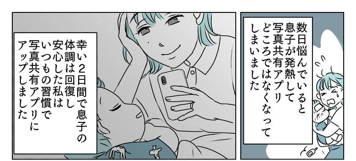 数日悩んでいると、息子が発熱。幸い2日間で回復しました。安心した私は、息子がスヤスヤ眠る姿をそっと撮影し、いつもの習慣で写真共有アプリにアップしました。息子は最近買ったお気に入りのキリンのパジャマを着ています。