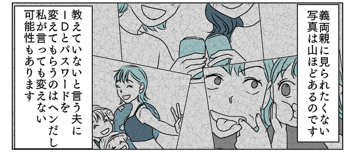 私が夫に写真共有アプリのIDとパスワードを義両親に教えたのかと問いただすも、夫は「教えてない」と繰り返すばかり。