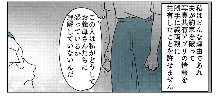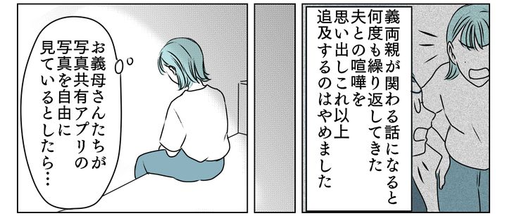 私(フクオカナツキ、30代)は夫(タミオ、40代)と5歳の娘(リナ)、2歳の息子(コウ)との4人暮らし。私は結婚当初から義母(マサヨ、70代)と義父(ヒデトシ、70代)のことが苦手で距離を置いています。しかしある日、私は夫婦だけで使っている写真共有アプリの写真を義両親も見ていることに気付きます。私が問い詰めると、夫はアプリの情報は共有していないと言いますが、明らかに動揺していました。