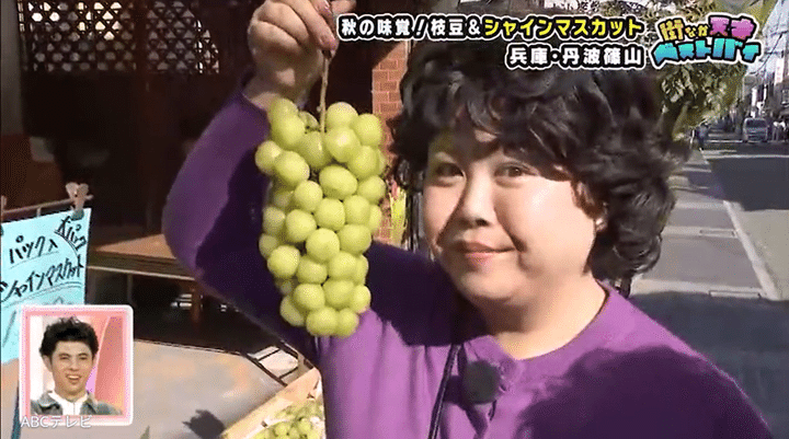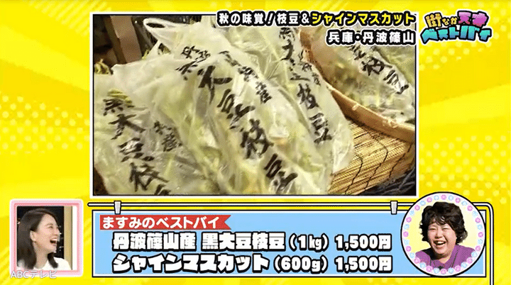 ますみは特にシャインマスカットを気に入り、「あたしも結構ねブリンブリン言われんねんけど、この子もブリンブリン!」と大興奮。ロケ序盤にもかかわらず、シャインマスカットのほか、収穫したての黒大豆枝豆も購入しちゃいました!