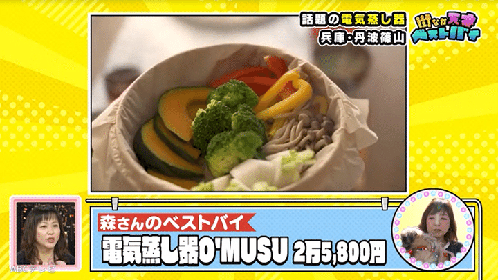 天才ピアニストが最初にインタビューしたのは、丹波篠山産の枝豆を毎年求めて神戸から訪れている女性。食にこだわる女性のベストバイは、ほったらかし調理で本格せいろ蒸し料理ができる、電気蒸し器O’MUSU(オムス)です。彼女いわく、「野菜を蒸したらとにかくおいしいし、モヤシの上に豚肉をのせるとか」がおすすめなのだそう。後程ゲットした枝豆もO’MUSUで蒸して味わったそうです!