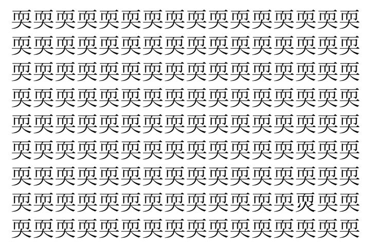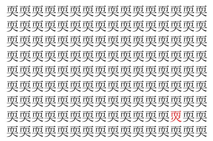 画像の中には、「耎」という漢字が縦に9行、横に16個並んでいます。 全部で144個となりますが・・・、そのうち1つは「異なる漢字」となってますよ!!