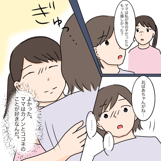 おばあちゃんが「女の子2人でがっかりした」と話しているのを偶然聞いてしまいショックを受けたカノン。もしかしたら私も同じ気持ちでいるのではないかと不安と悲しみで押しつぶされそうな顔で私に話してくれました。私はまずカノンをぎゅっと抱きしめました。私がどれだけ娘たちのことを愛しているか、カノンに伝わるように。