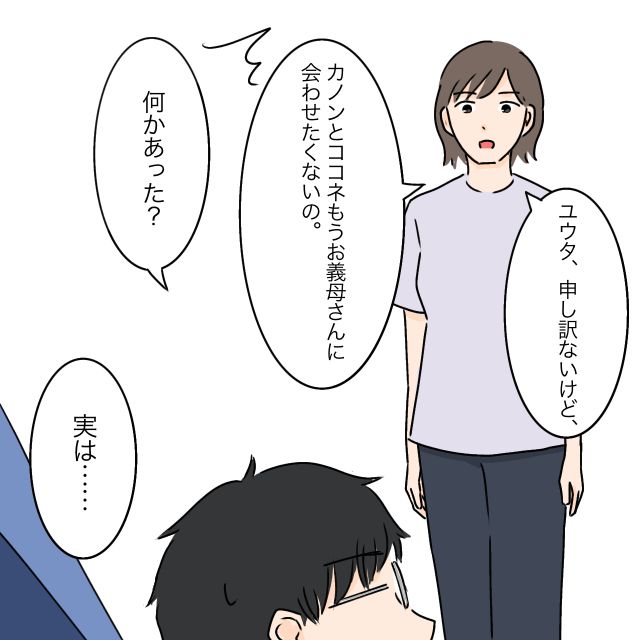 「ユウタ、申し訳ないけど、カノンとココネ、もうお義母さんに会わせたくないの」私はハッキリそう伝えました。私の気持ちにずっと寄り添ってくれていたユウタは驚きはしませんでしたが、「何かあった?」と優しく聞いてくれました。