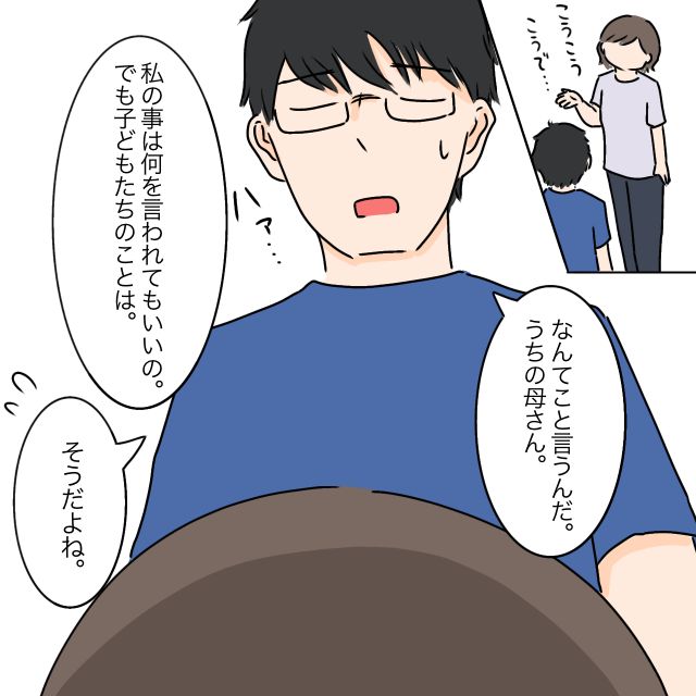 ユウタは話を聞き終えると、呆れたようにため息をつき「なんてこと言うんだ、うちの母さん」と言いました。「私の事は何を言われてもいいの、でも子どもたちの事は・・・」そう伝えると、ユウタは申し訳なさそうにうつむき「・・・そうだよね」と小さく答えました。