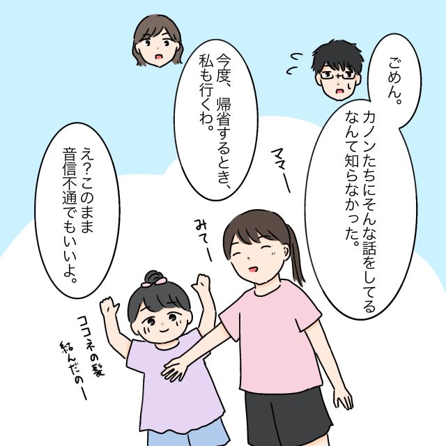 「ごめん、カノンたちにそんな話をしてるなんて知らなかった」と謝るユウタ。私は静かに息を整え「今度、帰省するとき私も行くわ」と伝えます。するとユウタは驚いたように「え?このまま音信不通でもいいよ」と戸惑った声を出しました。