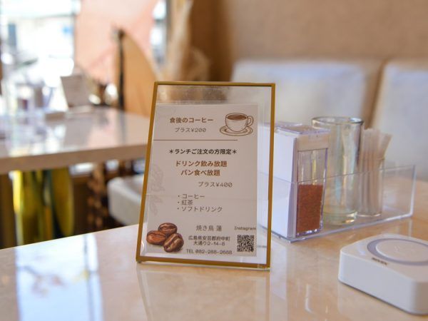 食後のコーヒーは+200円、ドリンク飲み放題・パン食べ放題は+400円です。