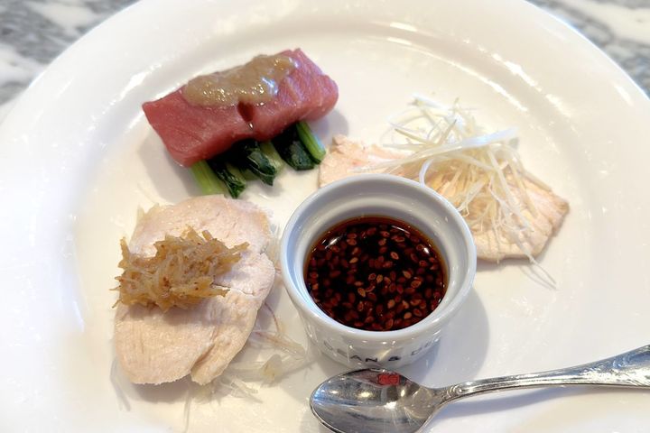 蒸し鶏(家庭なら市販のサラダチキンを使ってもよいかも)に白髪ネギを添え、「海鮮XO醬」や「口水醬」をかけて、味わいの変化を楽しむのも楽しいですね。