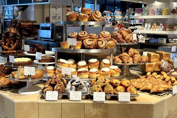 店内に足を踏み入れるとすぐに目に入るのが、圧巻のベーカリーコーナー。 種類豊富なクロワッサンにシナモンロール、マフィンにプレッツェル、デニッシュにケーキの数々。食事用のハード系パンや食パンも。日々の食卓に寄り添うデイリーブレッドから、華やかな味わいのアメリカンペイストリー、食材を合わせた食事パンまで揃っています。