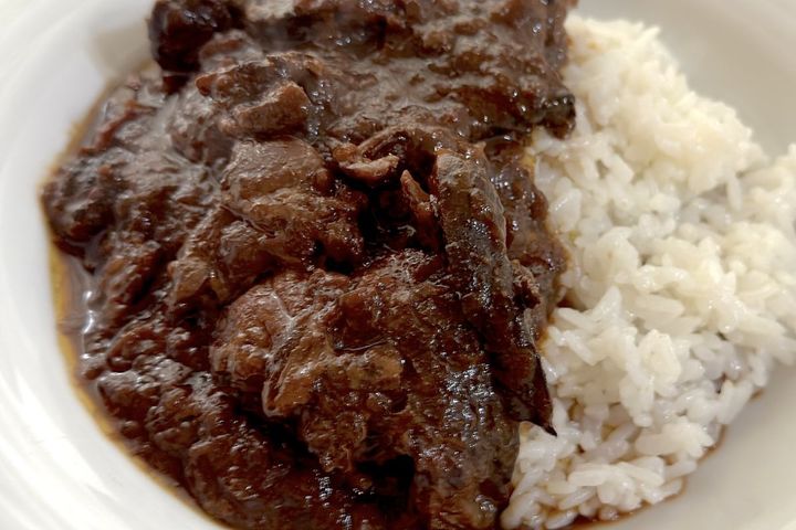パウチを湯煎で温め、カレーを白米の上にかけると、びっくりするほど大きな肉がゴロゴロと出てきました!