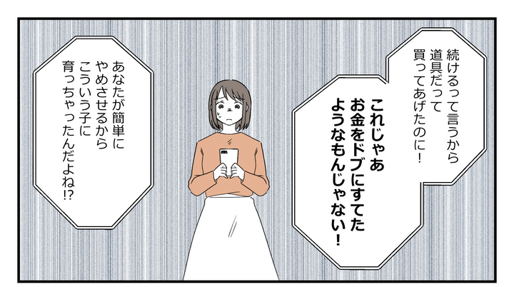義母からの電話は、思っていた以上に厳しいものでした。マサが「続ける」と言ったからこそ、道具を買いそろえたのに、すぐにやめてしまうなんて、お金を無駄にしたようなものだと義母は強く訴えました。