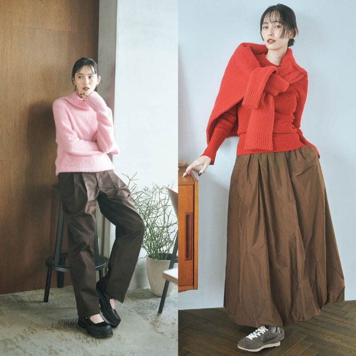 大人の落ち着きが魅力のブラウンにキレイ色を加えて華やかにイメチェン。トップスで取り入れれば、顔映りがよくなってブラウン初心者も簡単。なじみのいいトレンドの3色を投入して、遊びのきいた着こなしに。