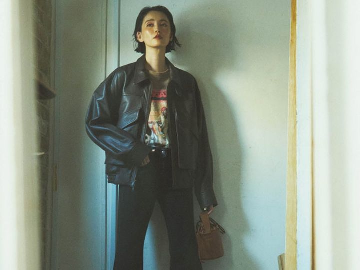 パンチのきいたTシャツとデニムで、いつもより少しだけ攻めたスタイルに。とはいえ、ベルボトムがキレイめなブラックなので、大人の品格はキープ。トレンドのレザーは、コーデ全体の引き締め役としても効果的で頼りになります。
