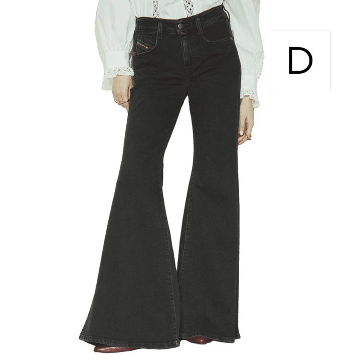 とんでもなくフレアなデザインが周囲の目を引く1本。メリハリのあるシルエットで、美脚効果も絶大です。ブラックは少しモードな印象もあり、意外とスタイリングしやすい! ¥46,200(ディーゼル/ディーゼル ジャパン)