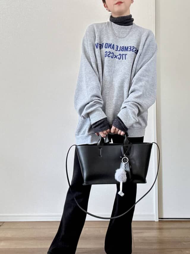 秋冬に大活躍のスウェットは、気を抜くと部屋着っぽさが出がち。でも、黒のシアータートルをインナーに仕込むだけで表情がガラッと変わります。