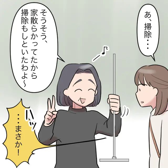 「あ、掃除・・」義母が掃除していたのに気づいてそう言うと、「そうそう、家散らかってたから掃除もしといたわよ~」とピースサインをする義母にそう言われ、「ハッ・・まさか!」と慌てて、