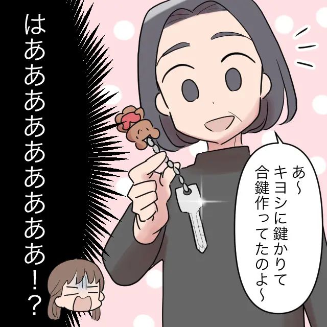 「あ~キヨシに鍵借りて合鍵作ってたのよ~」と笑顔でポケットから、かわいいキーホルダーに付けた鍵を取り出す義母。私は「はああああああああ!?」と心の中で叫びました。