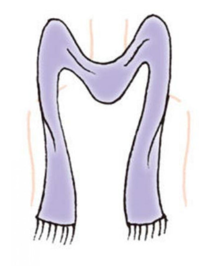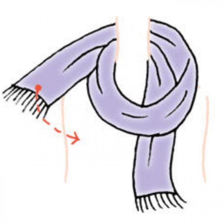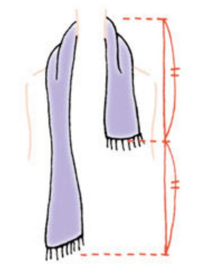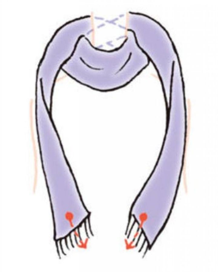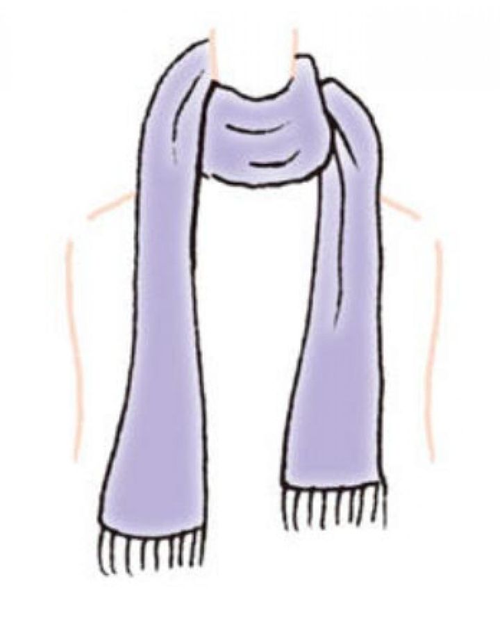 【1】適当な幅に折ったマフラーを首にかけ、左右が2:1の長さになるように調節する。