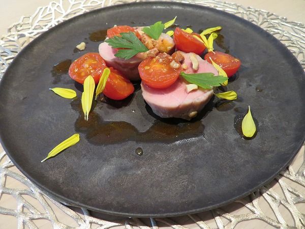 富士山の湧き水で育てられた赤富士サーモンを使ったカルパッチョ (C)「ムスブルミネ」メディア様向け内覧会・先行試食会