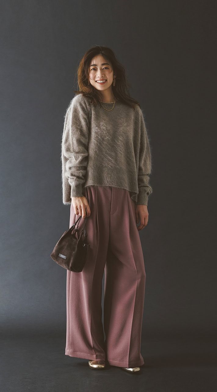 異なるトーンのブラウンを重ねたワントーンコーデ。上質な毛足のふわもこニットが、シンプルな着こなしをぐっと洗練させます。やさしげで品のある“こなれブラウン”は、今季の本命カラー。