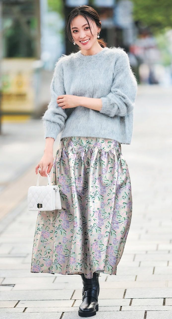 "淡トーン×ツヤスカート"で叶う、上品ニット