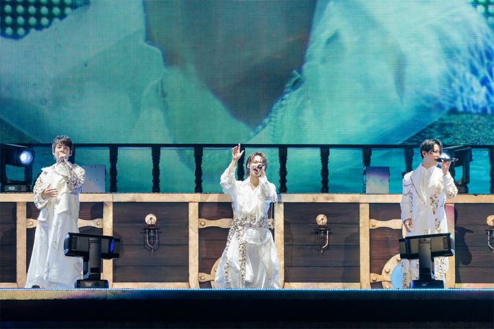 曇天に夜の帳がゆっくりと下りようとしていた17時──。海風がそよぐZOZOマリンスタジアムにはラストライブを見届けようと集まった3万人のファンの熱気であふれていた。ステージに設置された超巨大な海賊船のセットスクリーンには、スカルマークの帆が掲げられ、夕陽のようなオレンジ色のライトが灯されている。海賊船の乗組員は、もちろんKAT-TUNだ。亀梨和也さん、上田竜也さん、中丸雄一さんがゴンドラで華麗に登場すると、海賊船の帆がゴールドに輝きを放ち、「ハルカナ約束」のワンフレーズをアカペラで歌って幕開け。解散配信ライブを行った3月31日に「ファンと集まれる場所を改めて作る」と誓った、あの日の約束を果たした。