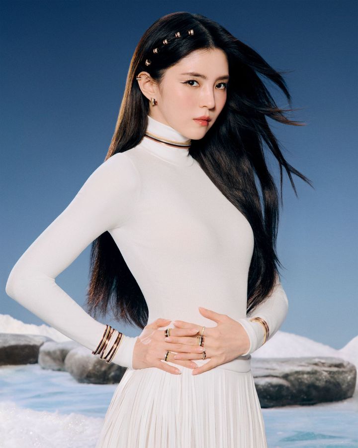 TWICEミナは、“セルパンボエム”をまとい、ホワイトゴールドとダイヤモンドが織り成す輝きとアクアプレーズの柔らかなブルーグリーンが冬の景色に溶け込む。さらに、イエロー、ホワイト、ピンクゴールドにブラウンPVDを重ねた“キャトル クラシック”を身に着け、自由で洗練されたスタイルを完成させた。