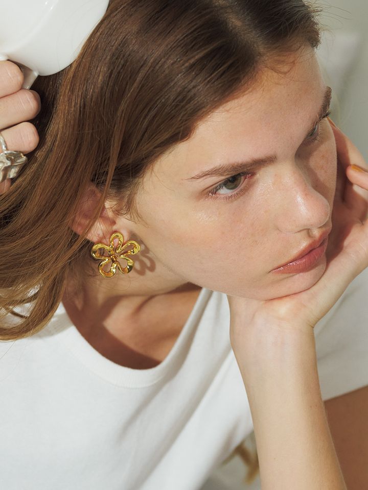 イヤリング/IRIS47(フーブス) シルバーリング/DEA DIA(ZUTTOHOLIC) 晴れやかな印象のフラワーイヤリングが主役。アーティな雰囲気を高めるなら、手元には大ぶり&個性派のシルバーリングをひとつ。