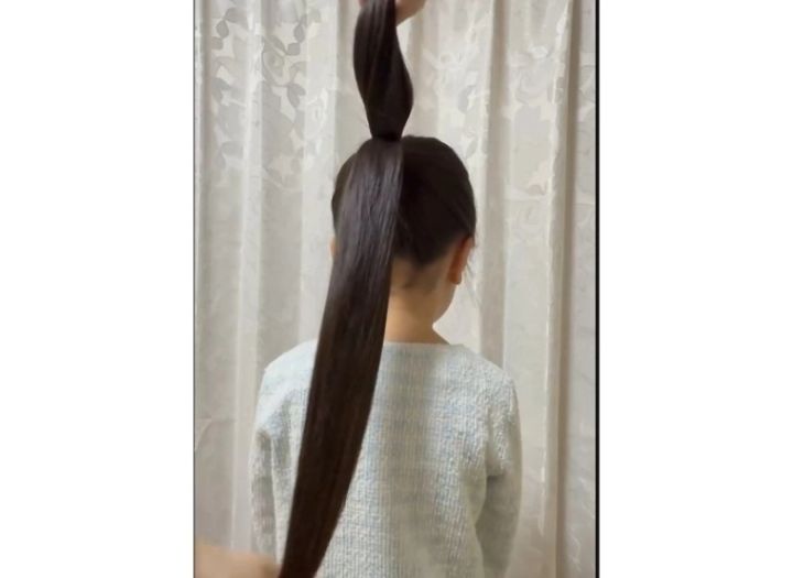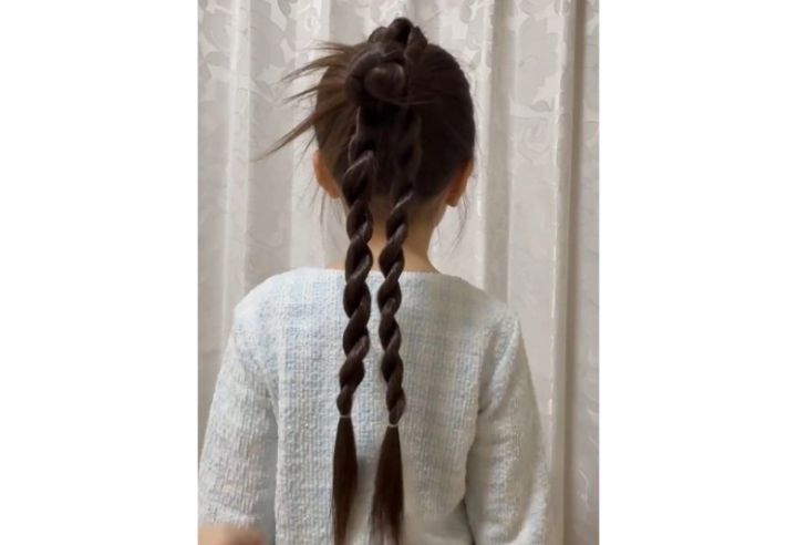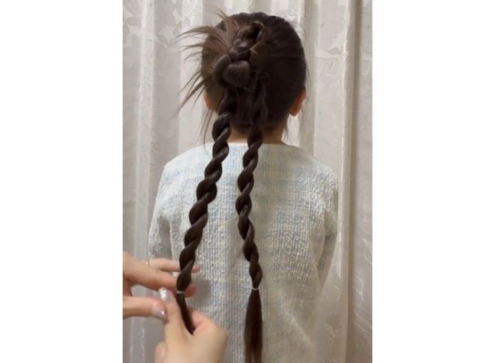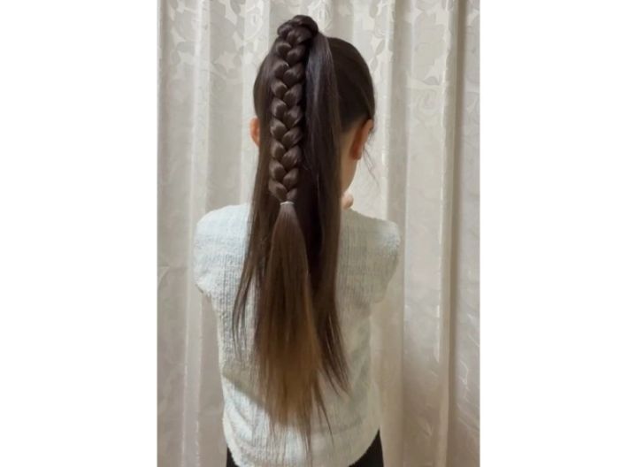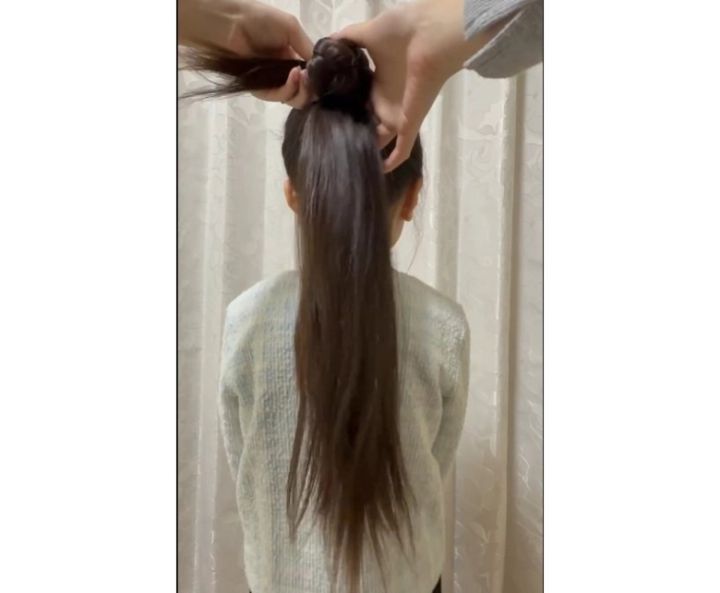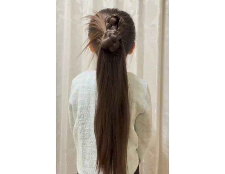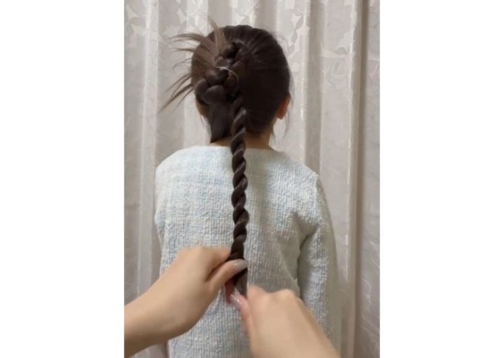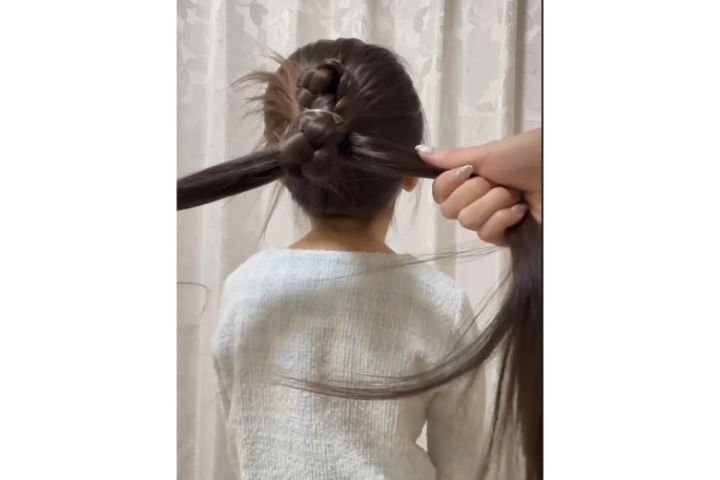 ⑤の三つ編みをくるくると縦に丸めて、②で結んだポニーテールのところで結びます。
