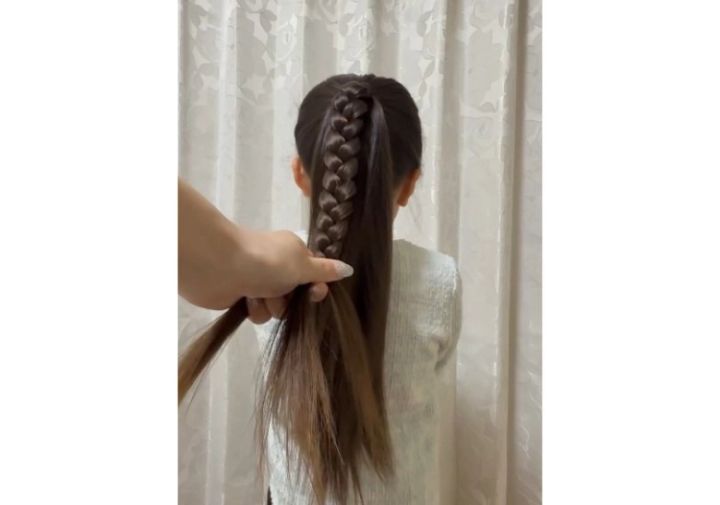 ある程度三つ編みをしたら、毛先を長めに残して結びます。