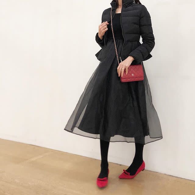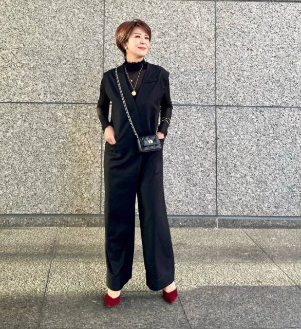 きれい色の中では「ボルドー・レッド(赤)の靴」がおすすめ。黒コーデのアクセントになり華やかさがグンとアップ。パンプスで取り入れると、モードに寄りがちなブラックコーデがレディライクに決まりますよ。