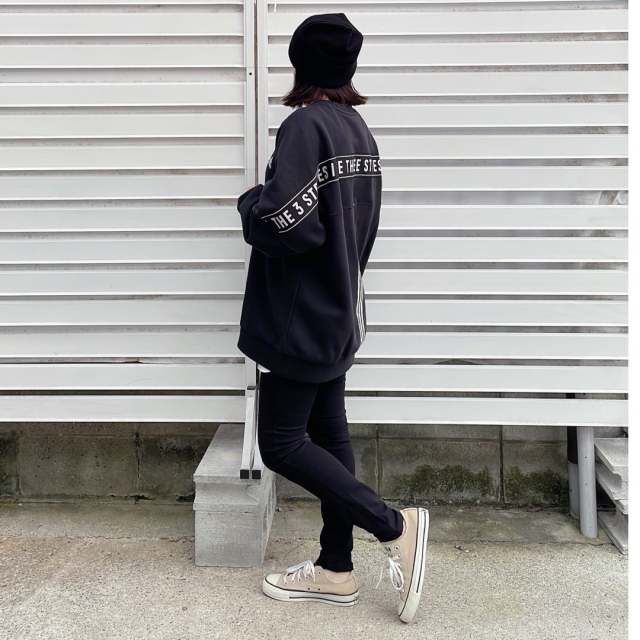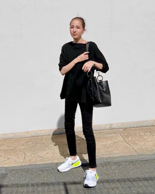 黒コーデに合う靴の色といえば「ホワイト(白)」。とりわけ人気なのが真っ白なスニーカーです。クリーンな色味のスニーカーはオールブラックの服装に映え、メリハリある着こなしに。重たくなりがちなブラックコーデに軽やかさを添え、こなれたルックスを演出します。