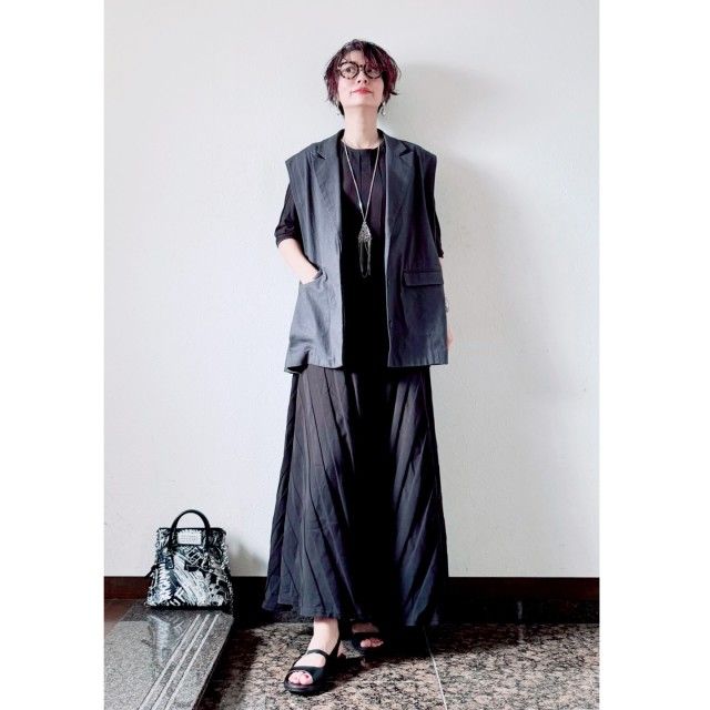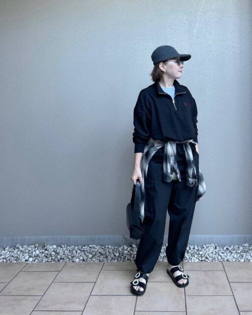 黒い服に黒の靴を合わせる場合は「サンダル」が最適。足の甲が見えることで、オールブラック独特の重さを払拭できます。しかもサンダルからチラリと素肌が覗くことで、普段使い感のあるブラックコーデに。