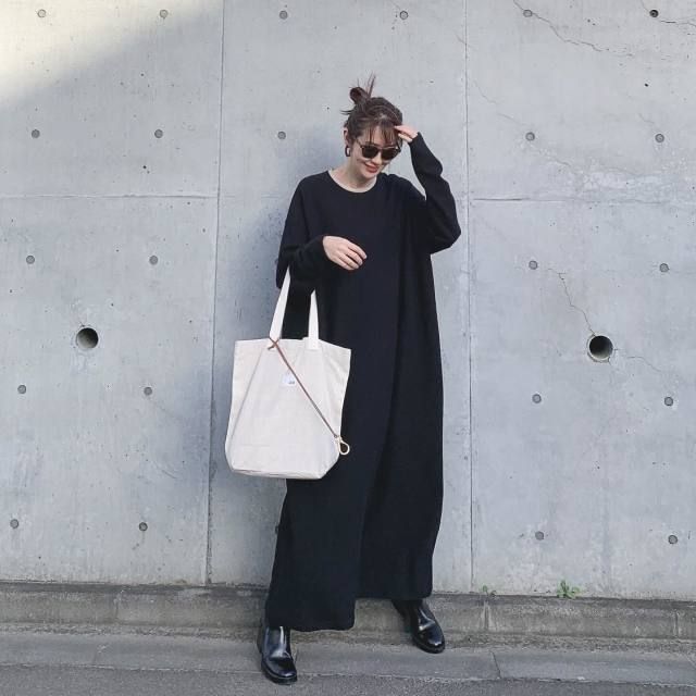 ちょっとそこまでのお買い物シーンに役立つのはストンとしたシルエットの黒ロングワンピース。こんなリラクシーなワンピースには色の違うトートバッグがお似合いです。