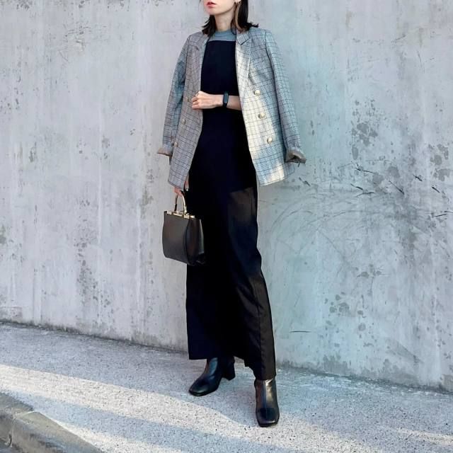 オケージョンやイベントシーンに役立つのは、落ち感のあるスムースな黒ワンピース。ブラウンのジャケットを羽織りダークトーンコーデにまとめたら、バッグはメタリックシルバーのスクエア型など程よく主張のあるものを選ぶと洗練度がアップします。アクセサリーもシルバーでまとめて統一感を高めましょう。