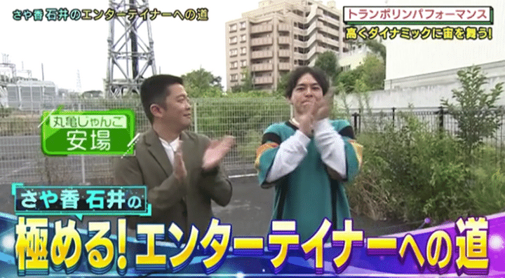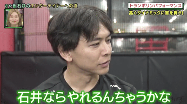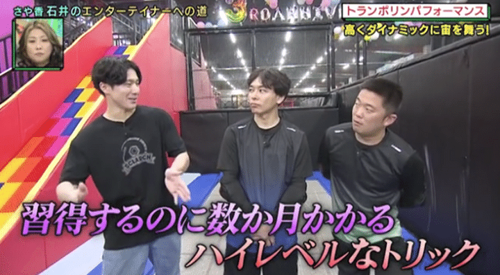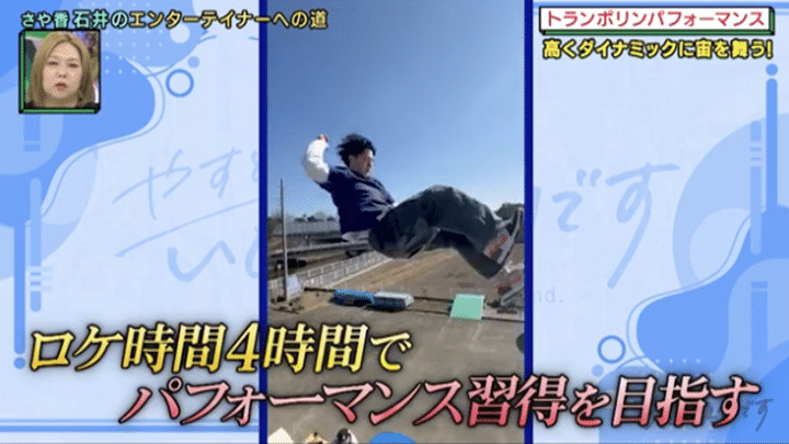 今回、後輩の丸亀じゃんご・安場とともに石井が技を教えてもらうのは、ウォールトランポリンの世界大会で5位に輝いたパフォーマー・RINtaroさん。まずは「上に跳ぶ」「座ってお尻跳び」という基本の動作に挑んだ2人は、なんと練習開始からわずか10分でクリアし、RINtaroさんを驚かせる。さらになんと「宙返り」もこなし、「石井ならできる!」と得意満面の石井。しかし、ここから技の難易度はぐっと上がり…。果たして、石井のチャレンジは成功なるか?