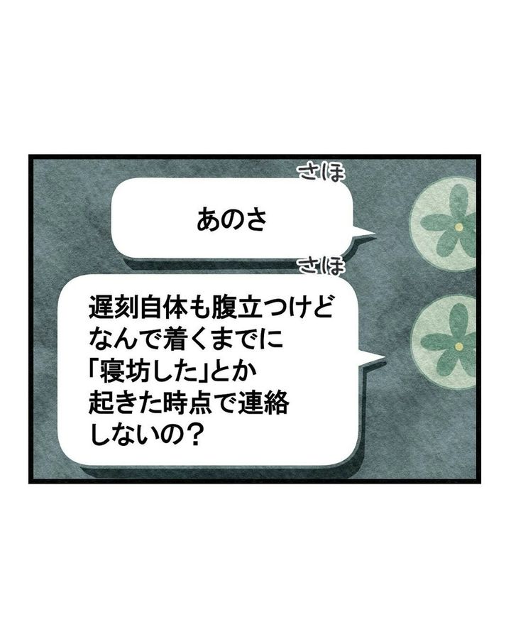 ふうかに対して、2人で会う時の時間の管理を散々伝えてきたさほ。しかしふうかの遅刻グセは結局元通りになってしまいました。遅刻をした際に連絡をしないことについては、ふうかにも言い分はあるようですが、それでも「全く連絡しない」というのは待っている方からすれば「あり得ない」ことでしょう。