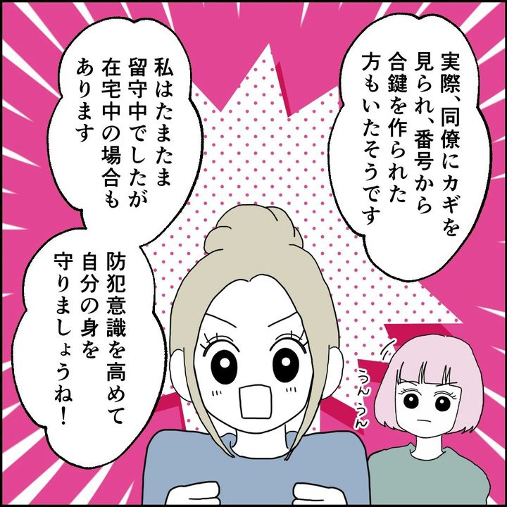 今回の漫画で描かれたように、鍵そのものを失くしていなくても、番号さえ分かれば誰でも簡単に合鍵を作れてしまうケースがあります。犯人がカフェのテーブルや職場のロッカーで、スマートフォンで鍵を一瞬撮影するだけで必要な情報を得てしまうこともあるのです。