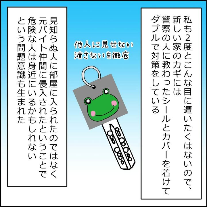 紙屋束実(@kamiya.tsukami)さんが、実話を元に描いたミステリー作品です。女子大生のレイは、一人暮らしの部屋に何者かが侵入している気配を感じます。仲間の協力を得てたどり着いた先には、驚愕の真実が。『盗まれたカギ』第1話をごらんください。