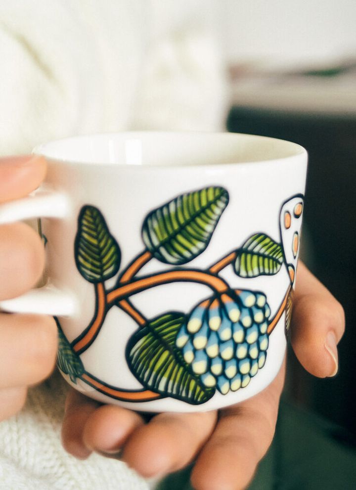 朝の一杯に〈マリメッコ〉のエネルギッシュなパターンのマグを。