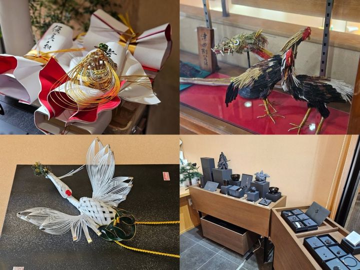 水引というと結婚式のご祝儀袋でなじみがあると思いますが、ご祝儀袋はあくまでも平面。平たく折り畳まないボリューミーな華やかなフォルムで独創的な発展を遂げてきたのが「加賀水引」です。こちらのお店の創業者である津田左右吉さんという方が造形的な水引の結びを編み出し、全国に広まるきっかけを作ったのだとか。